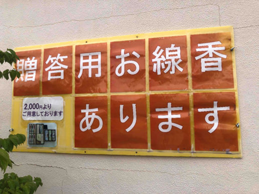 2023.05.15 店舗について, 商品紹介, 社員ブログ 【お線香の熨斗】|お墓の吉祥 長野県塩尻市 【お線香の熨斗】 東御店・茅野店・駒ケ根店・塩尻店では贈答用お線香を取り扱っています。 お通夜・ご葬儀や法事など行かれる際にお線香を持って行かれてはいかがでしょうか? 塩尻店では熨斗をお付けしていますので、お気軽に、ご用命下さい。 熨斗の表書き(熨斗の上段に書く内容)は、当店では一般的な「御供」(ごくう)を、ご用意しております。 家族以外の人が仏前や神前にお供えしていただく際の、お品物にお付けします。 お菓子など贈られる方も多いと思いますが、後に残らないものが良いとされます。 お線香やロウソクなど悪くなりませんので、お勧めいたします。 連名・会社名や役職等承ります。 執筆者:塩尻店H 関連記事 お線香 塩尻店お線香 店舗について, 商品紹介, 社員ブログ 花が咲きました|お墓の吉祥 長野県長野市前の記事 道祖神販売しています。駒ヶ根店|お墓の吉祥 長野県駒ヶ…次の記事