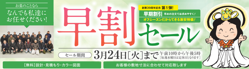 現在、当店では2月6日(金)~3月24日(火)まで「早割セール」を開催しております!